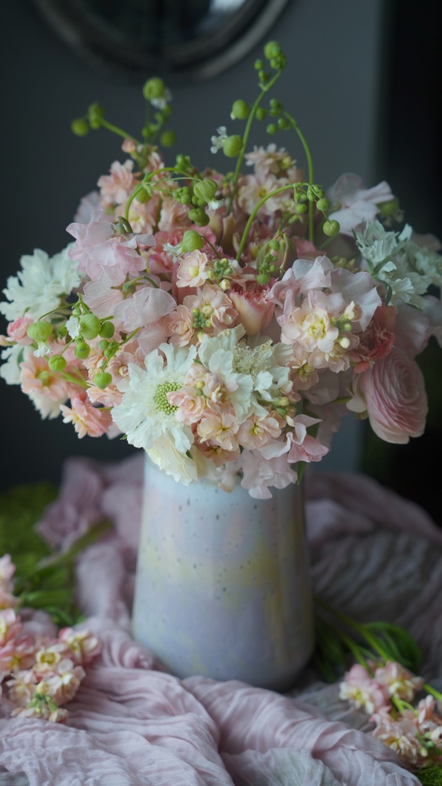 バラやラナンキュラスなど この時期のお花達を束ねます 草花が賑やかに彩りを添えてます(。•ᴗ•。) お色はピンク系、アイボリー系 とお選びできます お任せの花合わせとなります 当日の市場によって花材は少し変わります 自分で束ねたい方には花材送りもしてます