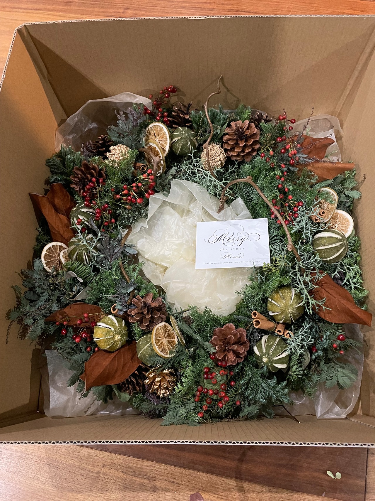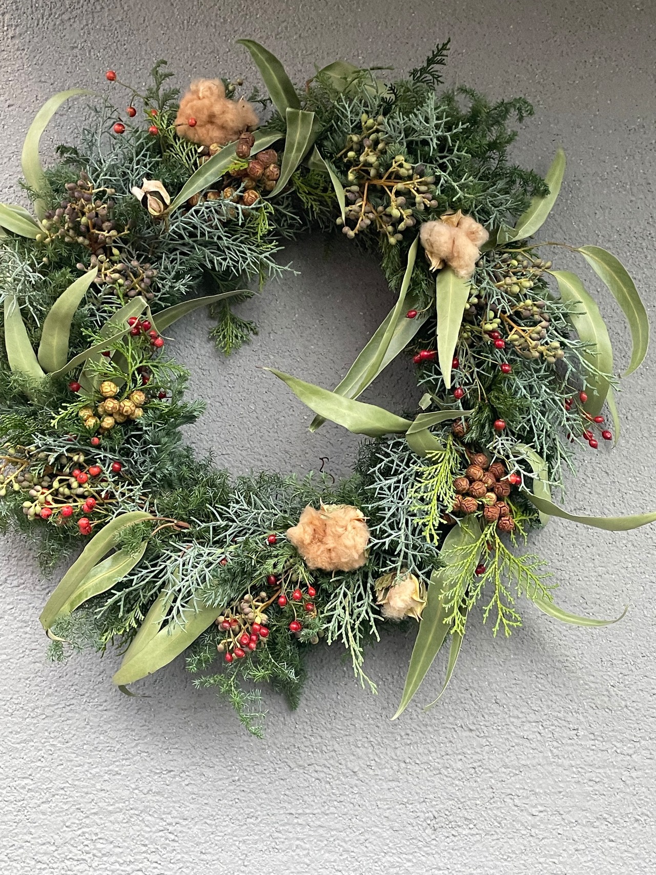 薩摩スギ、ブルーアイスなど針葉樹をたっぷり使って冬の植物のグリーンのグラデーションの
