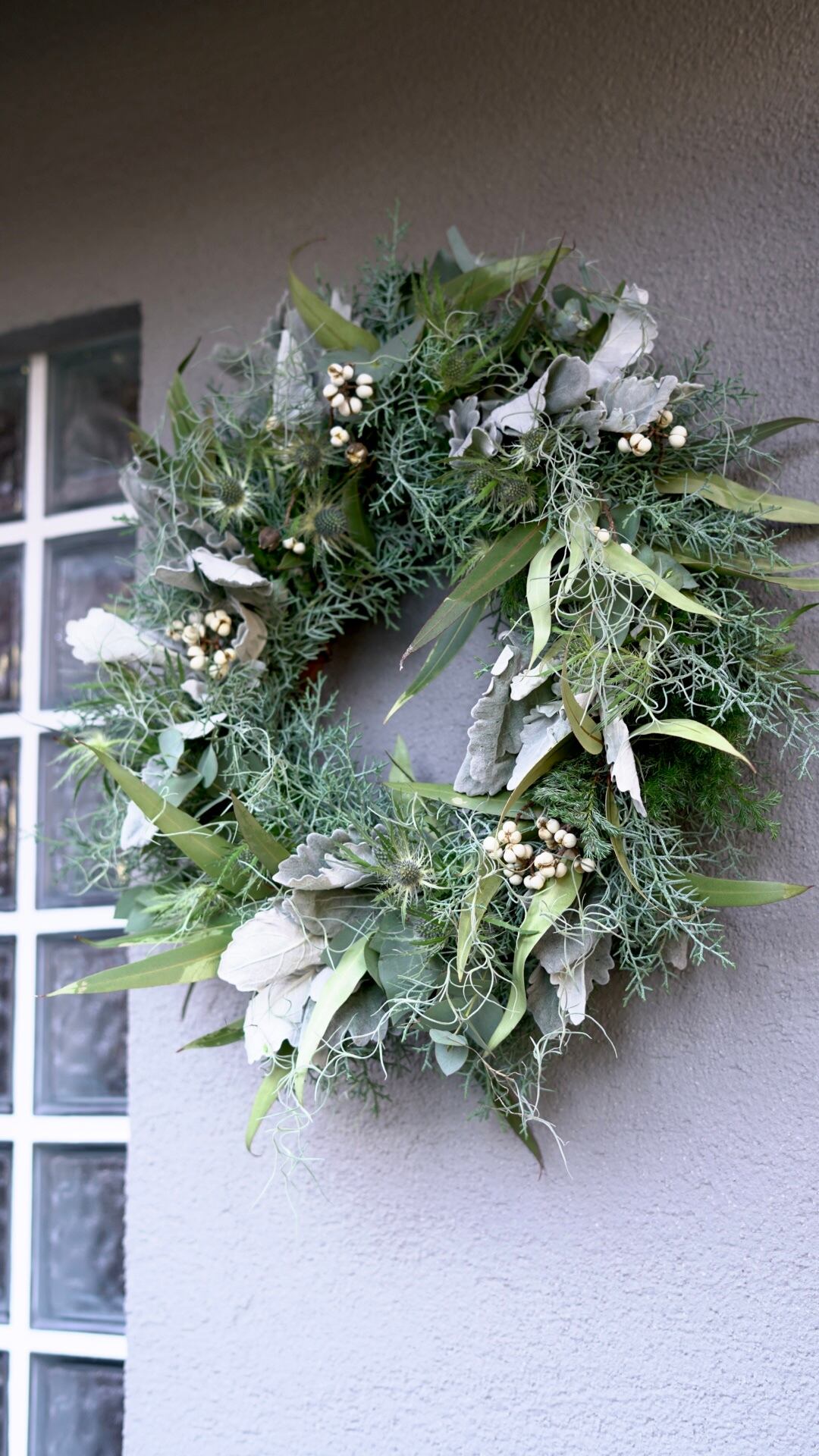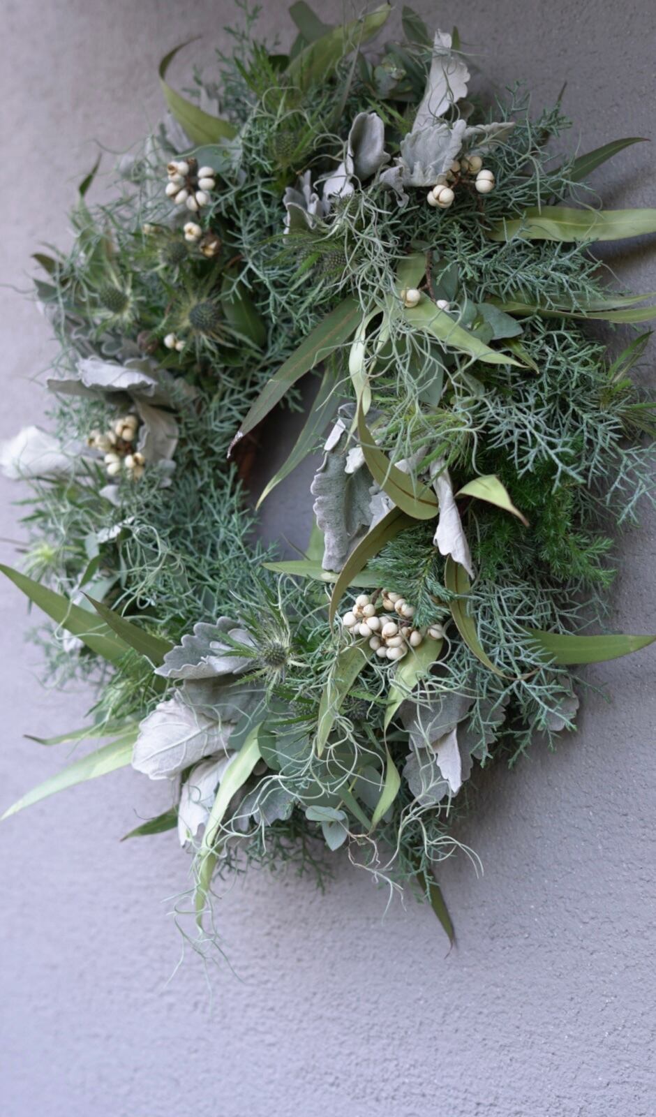 針葉樹、グレージュなユーカリ、冬の実物などあしらったクリスマスリース